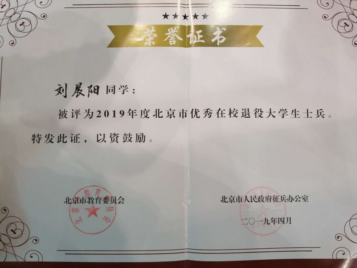 刘晨阳同学在服役期间两次获得“优秀士兵”称号,日常训练严格刻苦,比武演习名列前茅,为祖国的国防事业做出了贡献。退役复学后,更是把军队里的好作风、好习惯带到日常学习中,学习目标明确,高标准严要求。先后获得北京市“三好学生”、“英国上市公司365青年五四奖章”等荣誉称号。